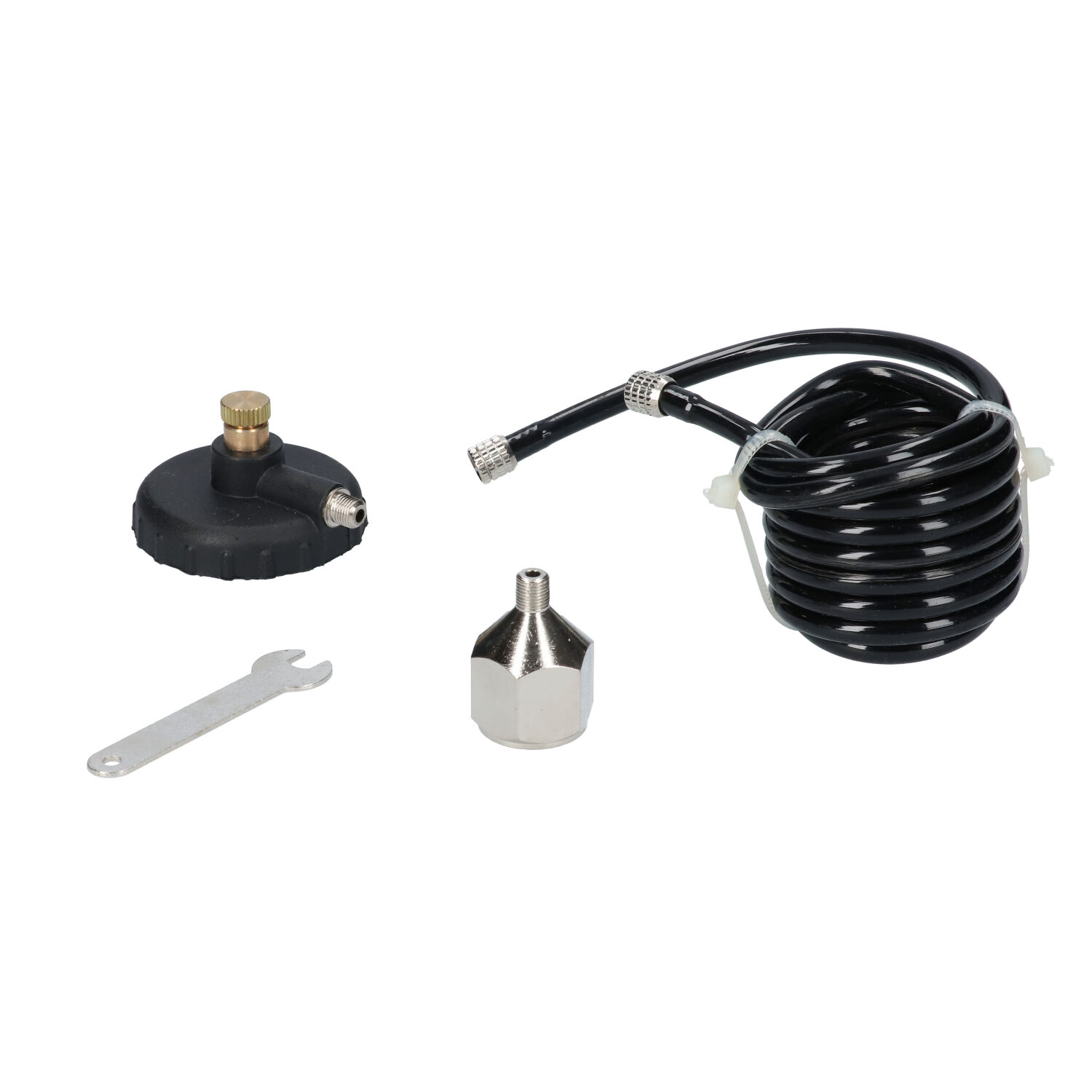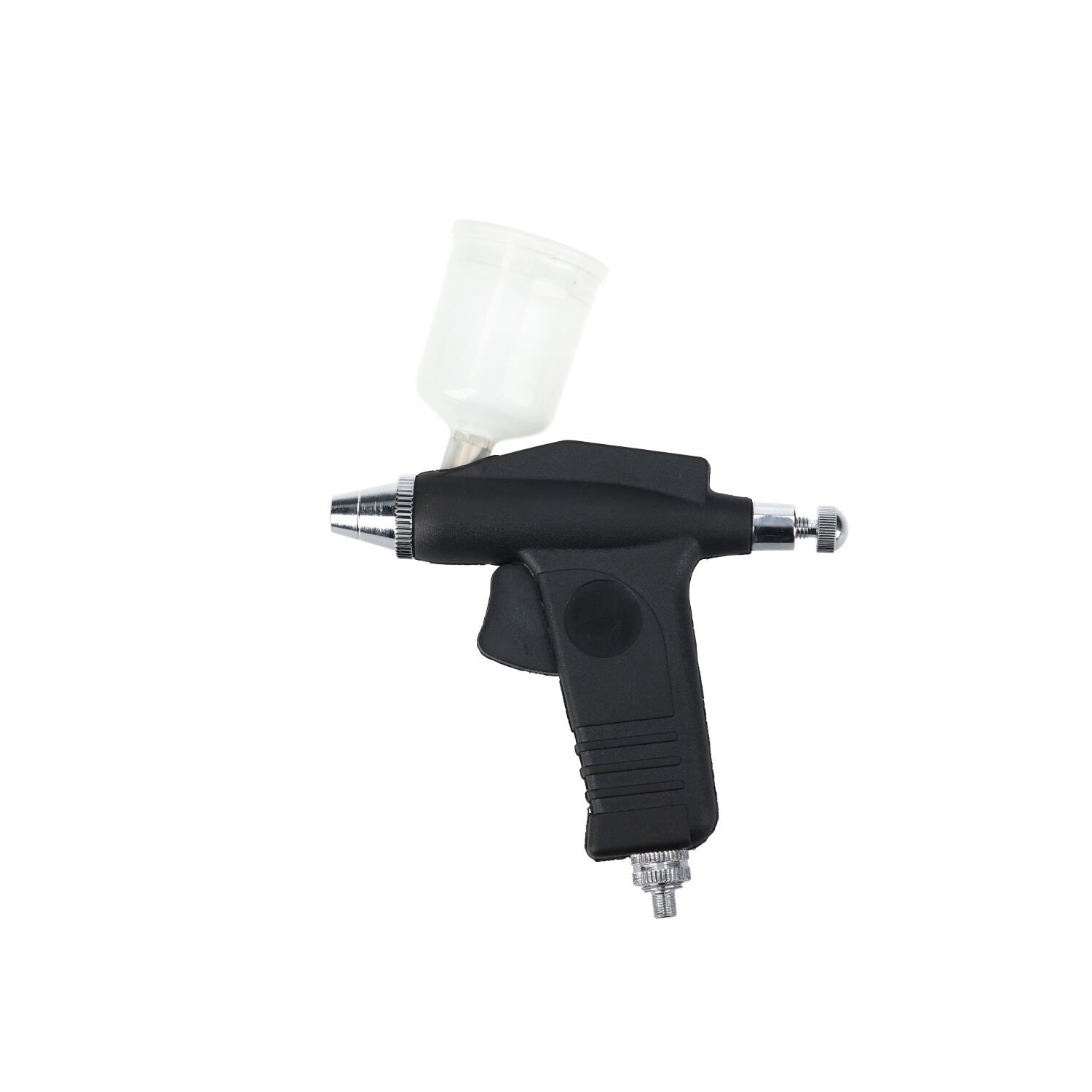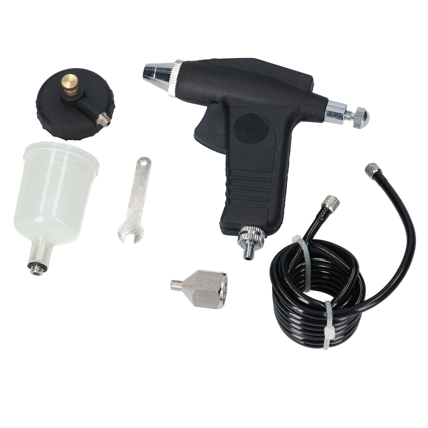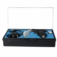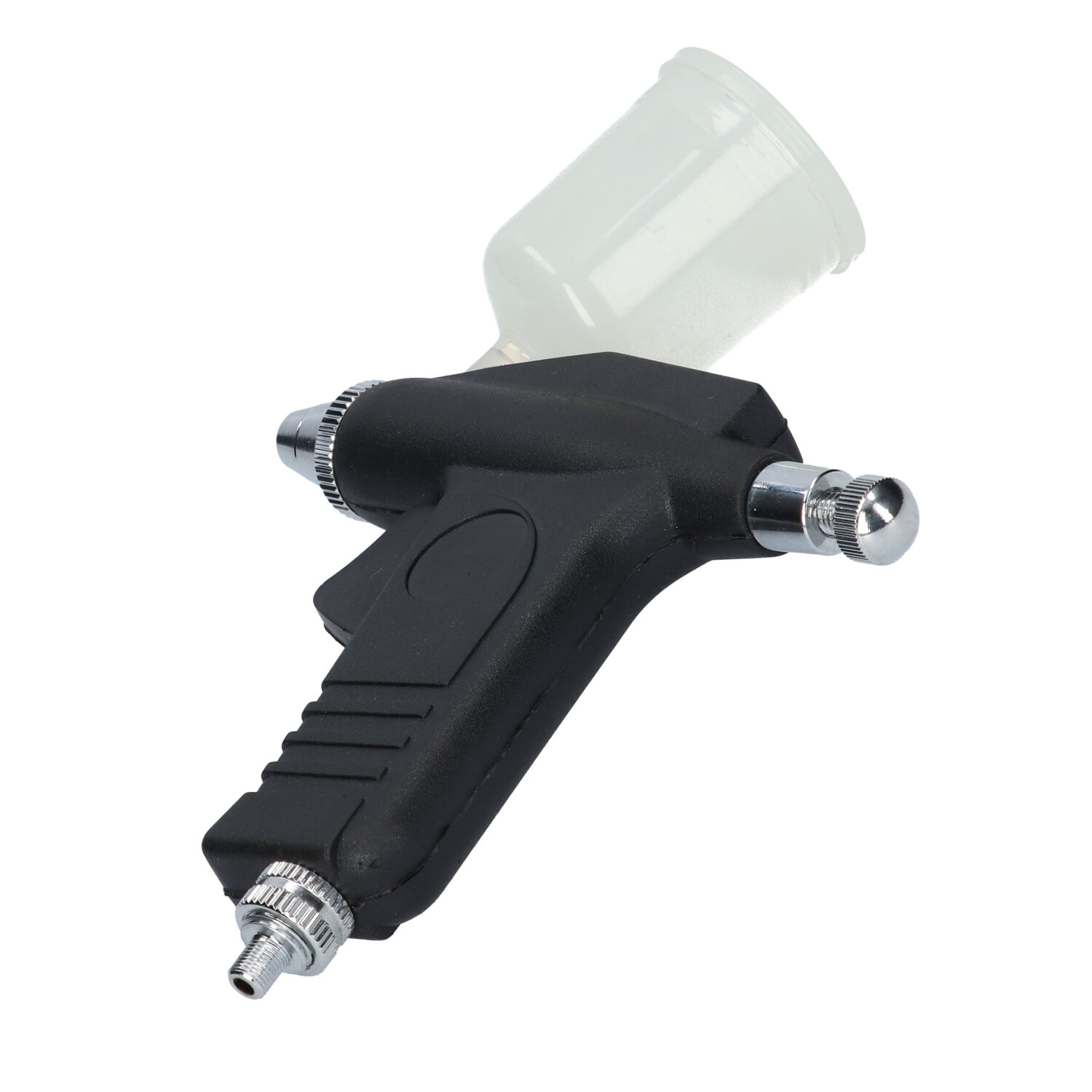 Профессиональный аэрограф с верхним бачком. Сопло 0,3мм, минимальное давлени 2 Bar. С регулятором подачи краски, Комплект со шлангом, баночками, ключем, переходником для шланга и адаптором для баллонов со сжатым воздухом.