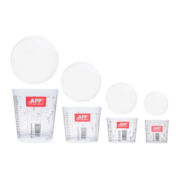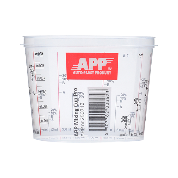 APP Mixing Cup Pro – это одноразовые стаканчики, предназначенные для смешивания красок и лаков. Изготовлены из гибкого и прочного полипропилена, устойчивого к химическим веществам, используемым в автомобильных и промышленных покрасочных мастерских. Точные пропорционные шкалы позволяют смешать желаемое количество продукта, при сохранении правильного соотношения компонентов смеси. Шкала читаются изнутри чашки. Для регулирования вязкости смеси предусмотрены маркеры для растворителя в количествах 10 или 20%.