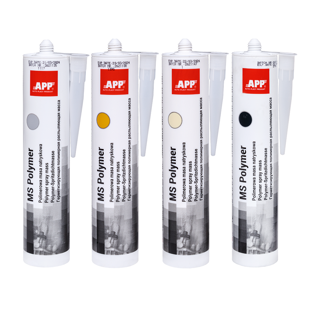 APP MS Polymer — полимерный герметик, сохраняемый эластичность. Наносится распылением. Предназначен для использования при ремонте и окраске кузова автомобиля. Обладает отличной адгезией к стеклу, нержавеющей стали, анодированному алюминию, окрашенным и эмалированным поверхностям, пластикам из стекловолокна. Его можно окрашивать всеми типами покрывных лаков и красок. Используется для воссоздания заводских швов в местах сварки кузовных элементов, а также как в качестве анигравия нижней части кузова и порогов.