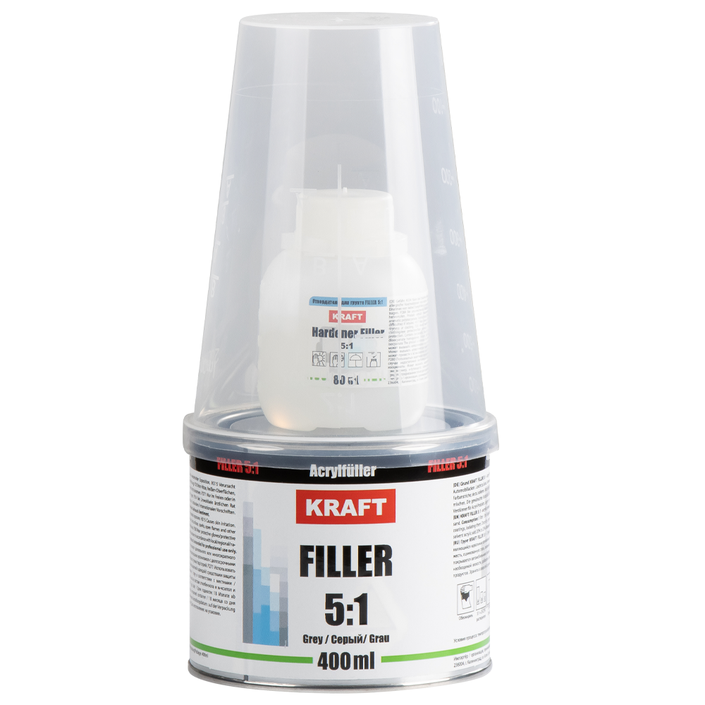 Грунт акриловый 5:1 с очень высоким содержанием сухих веществ класса VHS. Обладает антикоррозионными свойствами. Очень хороший наполнитель. Устойчив к образованию подтеков, идеально растекается после высыхания. Наносить от 2 до 3 слоев пульверизатором с соплом 1,6-1,8мм. Создает толстый слой (более толстый слой, чем грунт KRAFT FILLER 4:1) и легко шлифуется. Применяется на неотделанную жесть, оцинкованную сталь, алюминий, полиэфирные и полистироловые шпаклевки и старые лакокрасочные покрытия, изолируя их и обеспечивая антикоррозионную защиту. После высыхания и шлифования (как ручного, так и машинного) может покрываться автомобильными красками и лаками. Расход: 5м²/1л.