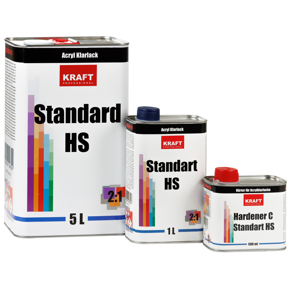 Прозрачный двухкомпонентный акриловый лак со средним сухим остатком. Лак высокого блеска, содержащий компоненты, защищающие от ультрафиолетовых лучей и пожелтения. Имеет очень хорошую текучесть и стекольную прозрачность. Характеризуется повышенной стойкостью к механическим, химическим и атмосферным воздействиям. Может использоваться как в обычных помещениях, так и в окрасочных камерах. Можно покрывать как обычные, так и водорастворимые краски. Также есть лак с ускоренным временем сушки KRAFT STANDARD HS FAST.