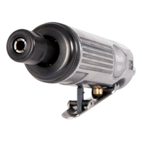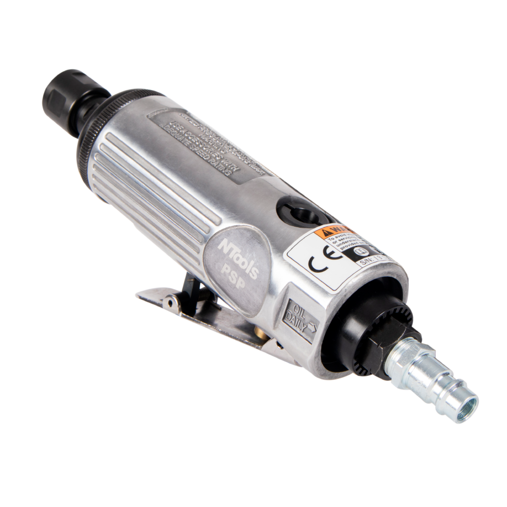 Пневматическая прямошлифовальная машинка – короткая, удобная, мощная. Имеет простое строение и рычажный клапан безопасности (HV), предохраняющий от случайного включения. Выход воздуха в задней части рукоятки не создает пыли на рабочем месте. Цанга для крепления инструмента 6мм.