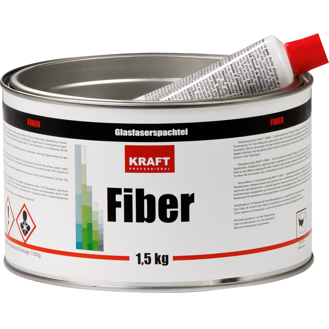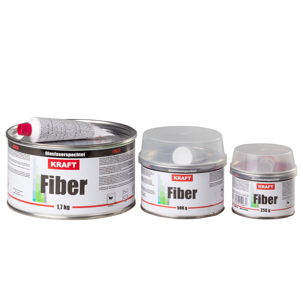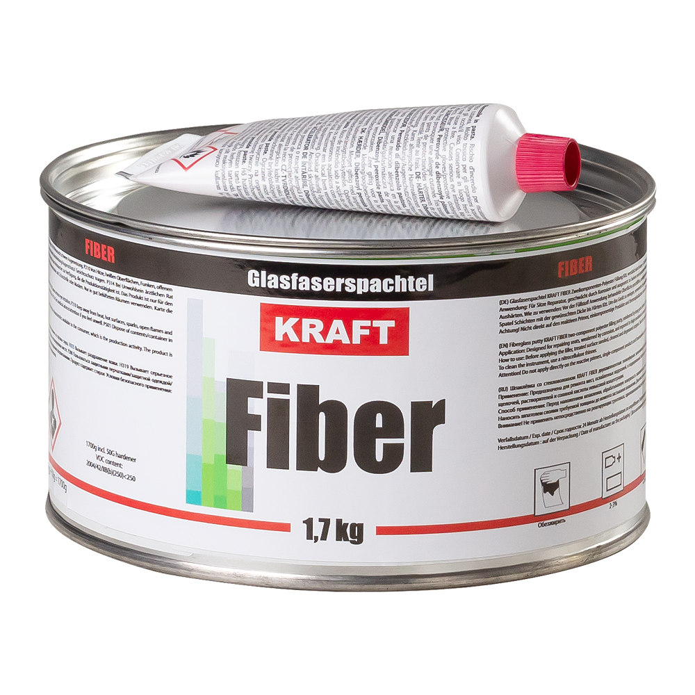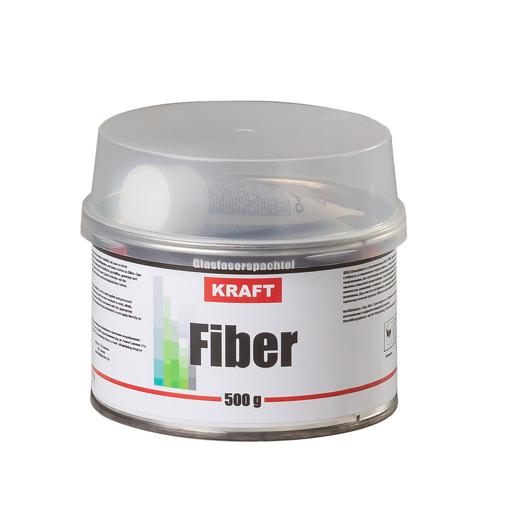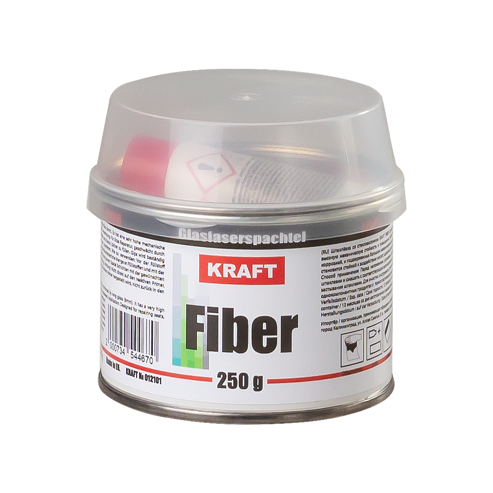Шпаклевка полиэфирная с наполнителем из стекловолокна (3-5мм). Характеризуется высокой способностью к моделированию поверхности и обработке грубым абразивом. Также хорошо обрабатывается и средней величины абразивом (Р120-Р150). При этом не забивает абразивную бумагу и имеет хорошую адгезию к поверхности из стали, алюминия и пластиков из стекловолокна. Легко наносится на поверхность даже тонким слоем. KRAFT FIBER имеет безпористую структуру, что делает возможным использование этой шпаклевки непосредственно под грунт. Предназначена для сухой ручной и машинной обработки.