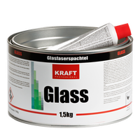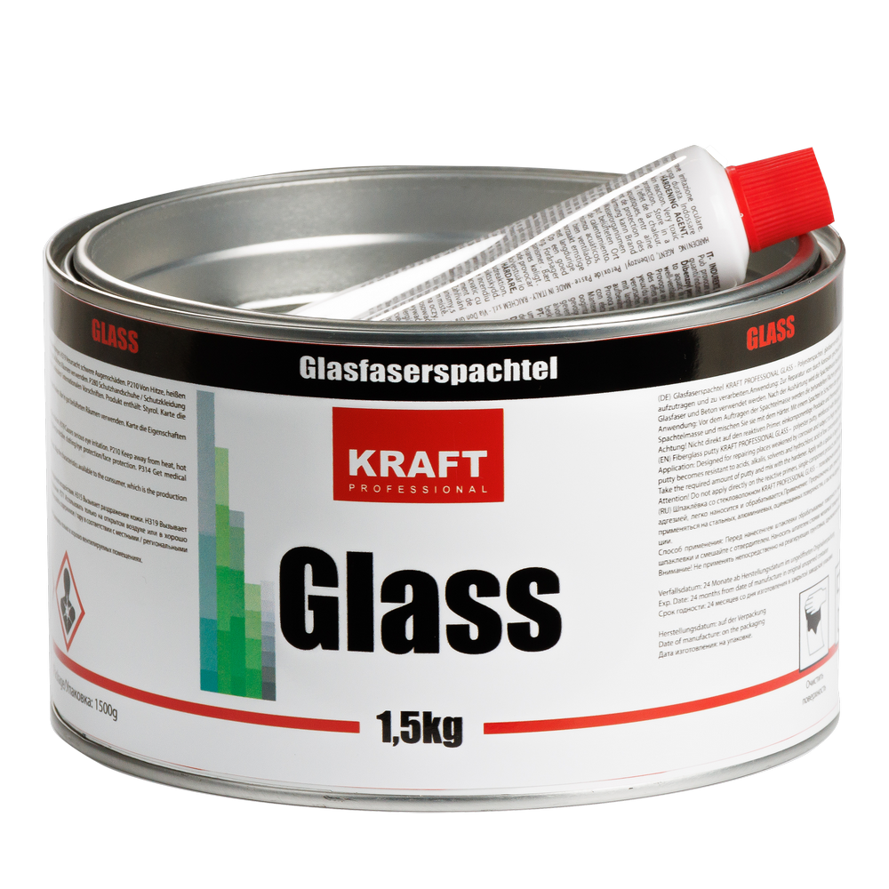Шпатлевка полиэфирная армирующая, с наполнителем из стекловолокна (5-7мм). Характеризуется высокой способностью к моделированию поверхности и обработке грубым абразивом. Также хорошо обрабатывается и средней величины абразивом (Р120-Р150). При этом не забивает абразивную бумагу и имеет хорошую адгезию к поверхности из стали, алюминия и пластиков из стекловолокна. Легко наносится на поверхность даже тонким слоем. KRAFT GLASS имеет беcпористую структуру, что делает возможным использование этой шпаклевки непосредственно под грунт. Предназначена для сухой ручной и машинной обработки.